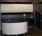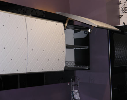Кухня «Глория 4» - Новое решение для российского рынка! Эффектные фасады из искусственной кожи. Скомбинирована с фасадами из ЛДСП, ламинированными Акрилайном с "глубоким" глянцевым отражением и обработаны алюминием по периметру.