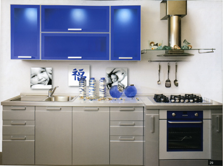 На фасадах из МДФ 16 мм с отделкой полиуретановыми шелковисто-матовыми или высокоглянцевыми эмалями наносится стильный горизонтальный рисунок. Особенностью данного рисунка является фрезерование широкой горизонтальной полосы шириной 68,5 мм. Большой выбор цветов эмали, характерные элементы из алюминия и акрила позволяют создавать каждый раз новые композиции и интересные проекты. В данной модели отсутствуют элементы с гнутыми фасадами. Фасадные элементы с нанесением рисунка могут комплектоваться стеклом «скрин».