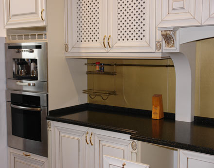 Шедевры великого Леонардо вдохновили современных итальянских мастеров на создание этого гарнитура: роскошный портал, резные колонны и пилястры, матовая позолота на фасадах нежного молочного цвета. Кухня для ценителей творчества эпохи Возрождения.