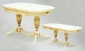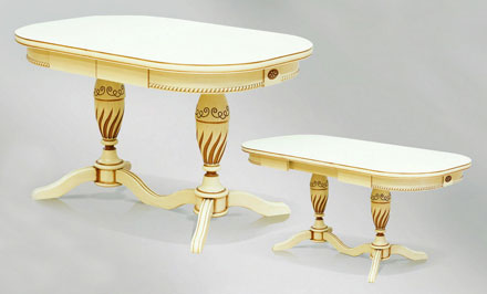 Крышка стола: овал, шпонированная ДСП. Подстолья («ноги») — массив ольхи и ясеня. Размеры: 120×80/160×80